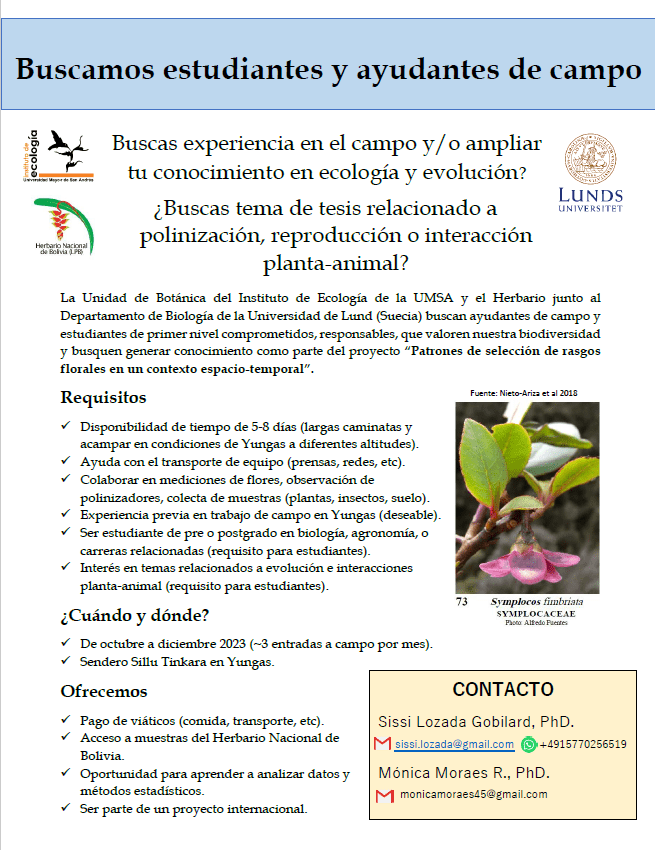 Convocatoria para estudiantes y ayudantes de campo para proyecto en Yungas, Bolivia Posted bySissi Lozada GobilardMay 12, 2023Posted inUncategorized Share this: Click to share on X (Opens in new window) X Click to share on Facebook (Opens in new window) Facebook Click to share on LinkedIn (Opens in new window) LinkedIn Click to email a link to a friend (Opens in new window) Email Like Loading... Related Published by Sissi Lozada Gobilard I am an evolutionary ecologist interested in plants, in particular, plant-pollinator interaction and flower evolution. View more posts