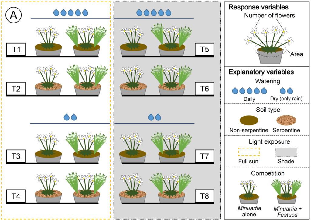 We also studied the effect of competition and abiotic conditions and how they change over time. We analyzed the effects of soil type, water, light and competition on the performance of Minuartia smejkalii (plant size, number of flowers) during 4 years (2017-2020).