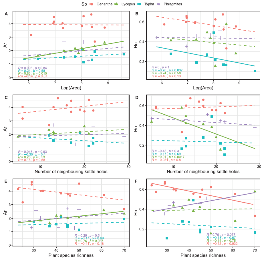 Lycopus europaeus, Typha latifolia, and Phragmites australis. Even though the non-clonal, outcrossing species showed very high genetic diversity overall, a negative trend with increasing plant species richness suggests locally smaller effective population sizes with increasing interspecific competition. In contrast, genetic diversity in the 2 clonal species Lycopus and Phragmites showed a positive trend with increasing kettle-hole area and with plant-species richness indicating pronounced competitive abilities, probably through rapid clonal expansion.