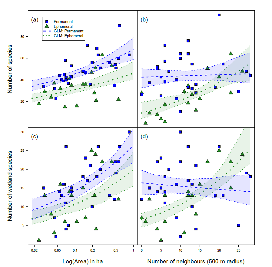 We found that large permanent kettle holes harbor more number of species but the plant composition differed between types of kettle holes. Interestingly, the degree of isolation (number of other surrounding kettle holes) was only important in the ephemeral ones. These results suggest that ephemeral ponds are more dynamic and depend on other surrounding ponds to get plant species. Also in these ephemeral ponds, dispersal traits of the plant communities were more adapted to be dispersed by humans (probably by farmers or agricultural tractors).