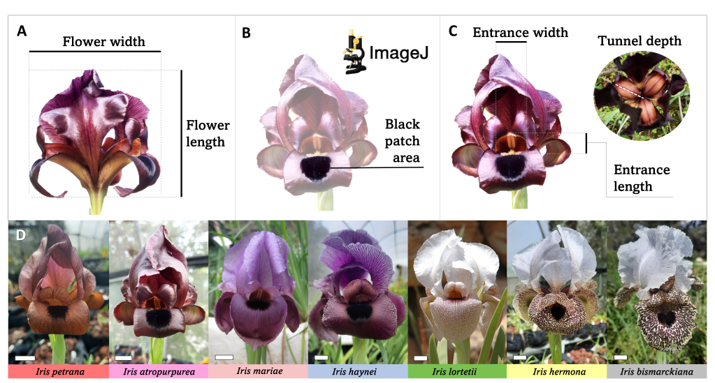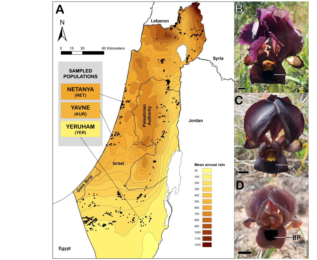 We studied the relation between flower size and heat reward in Royal irises (Iris atropurpurea and Iris petrana). We extensively measured flower size in three populations (NET, KUR, YER) and we found a decrease in size from north to south which correlates with the decrease in annual precipitation.