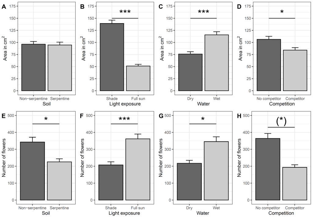 We found interactive complex effects and performance of M. smejkalii change over time and depend on soil type, water, light and competition. Competitive interactions mainly depend on light and soil type, with opposite tendencies depending on plant area vs number of flowers suggesting that abiotic conditions modify vegetative and reproductive investment.