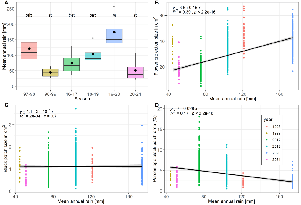 We studied how the climate (rainfall) affect flower size and black patch size over time in Iris petrana. We found that flower size is highly correlated with rainfall over the years, while black patch size was constant.