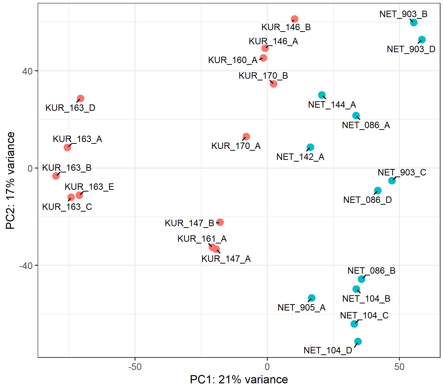 We are analyzing differential expressed genes between two populations of Iris atropurpurea (Large flowers: NET, Small flowers: KUR).